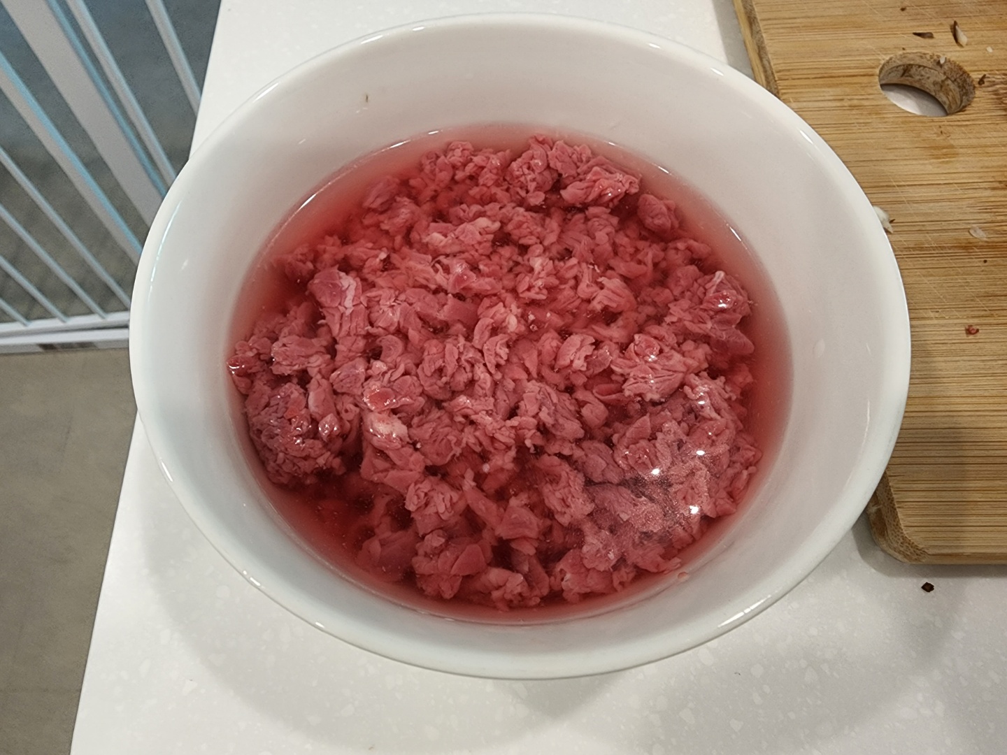 일단 소고기를 잘게 다져주세요. 그리고 물에 담궈서 핏물을 빼줍니다.